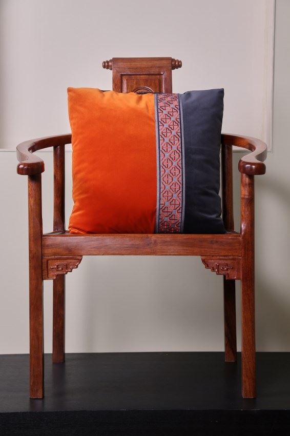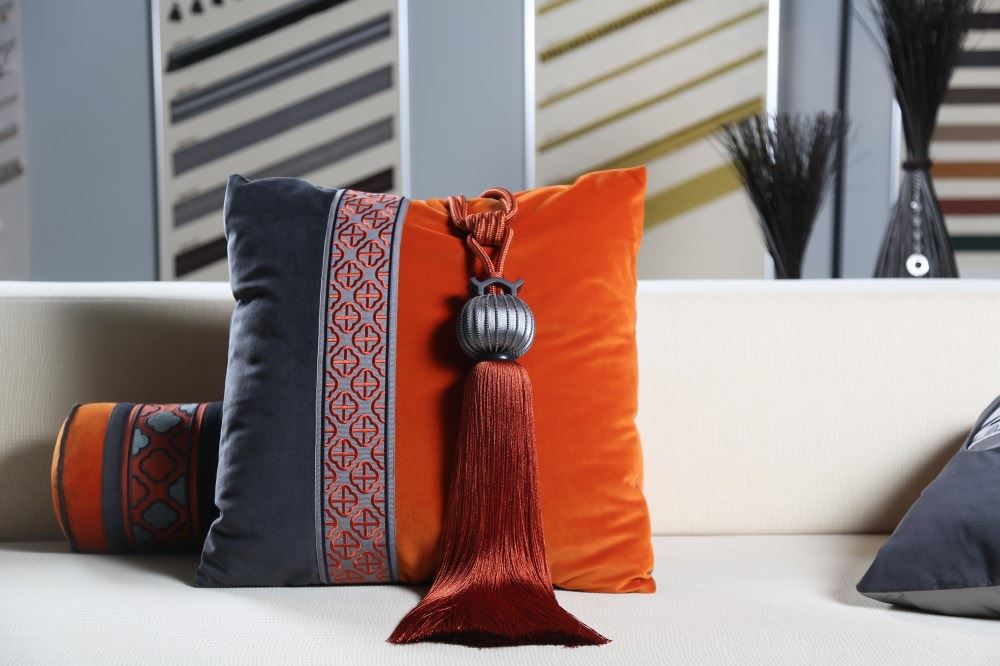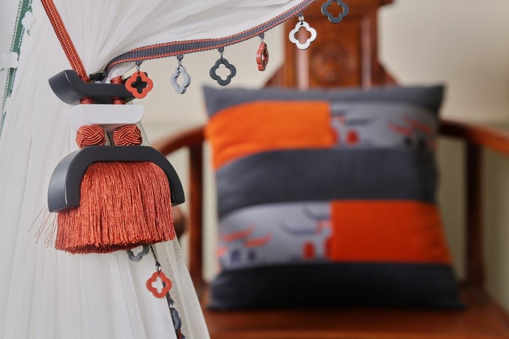 我們依據(jù)梅花窗的圖案,設(shè)計(jì)了兩款帶子,搭配窗簾和抱枕,把江南唯美的文化氛圍,通過與布藝的結(jié)合置入中式家居。